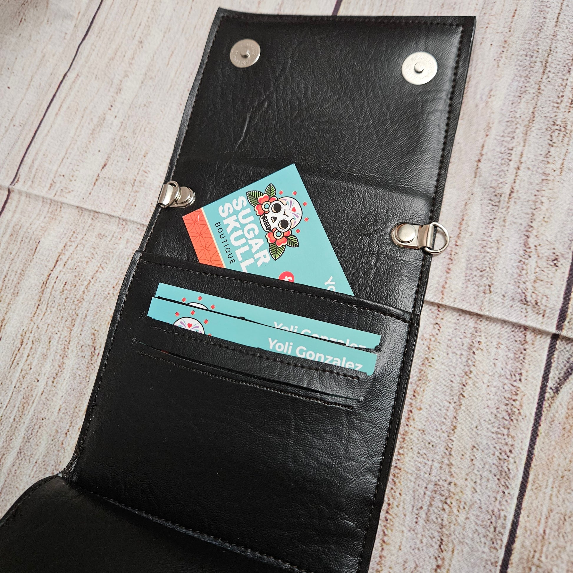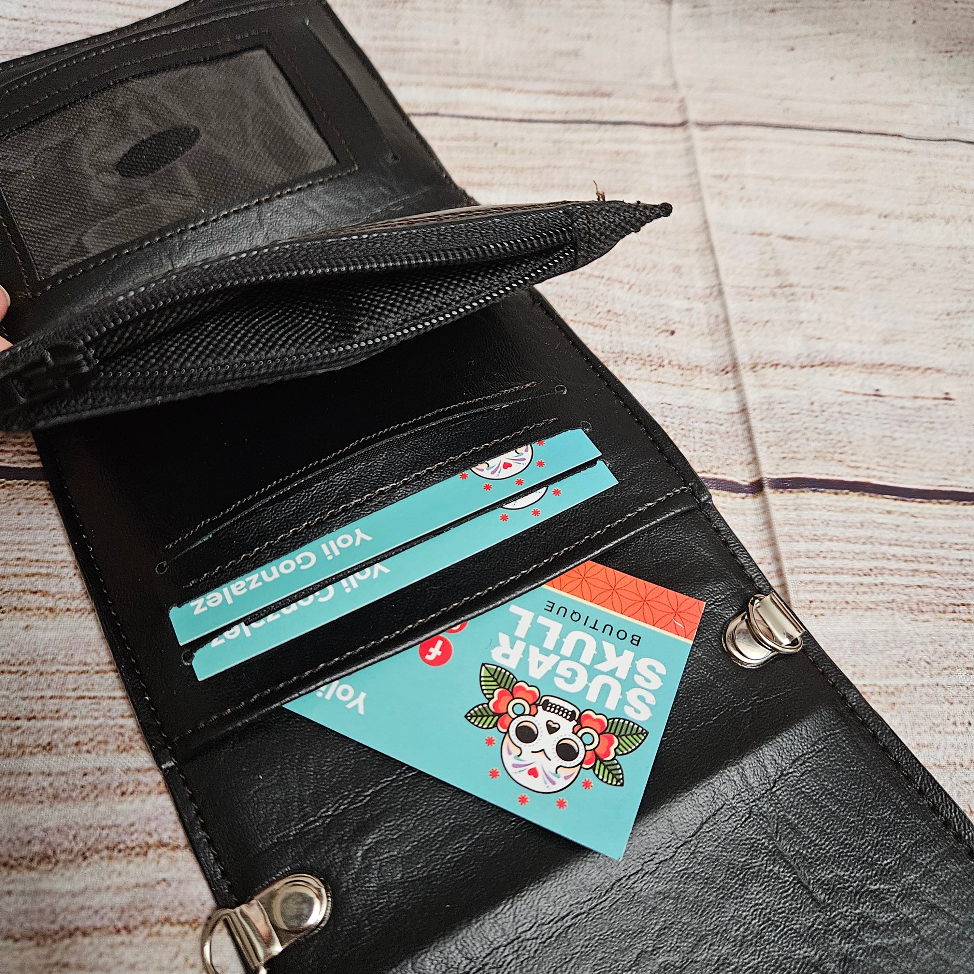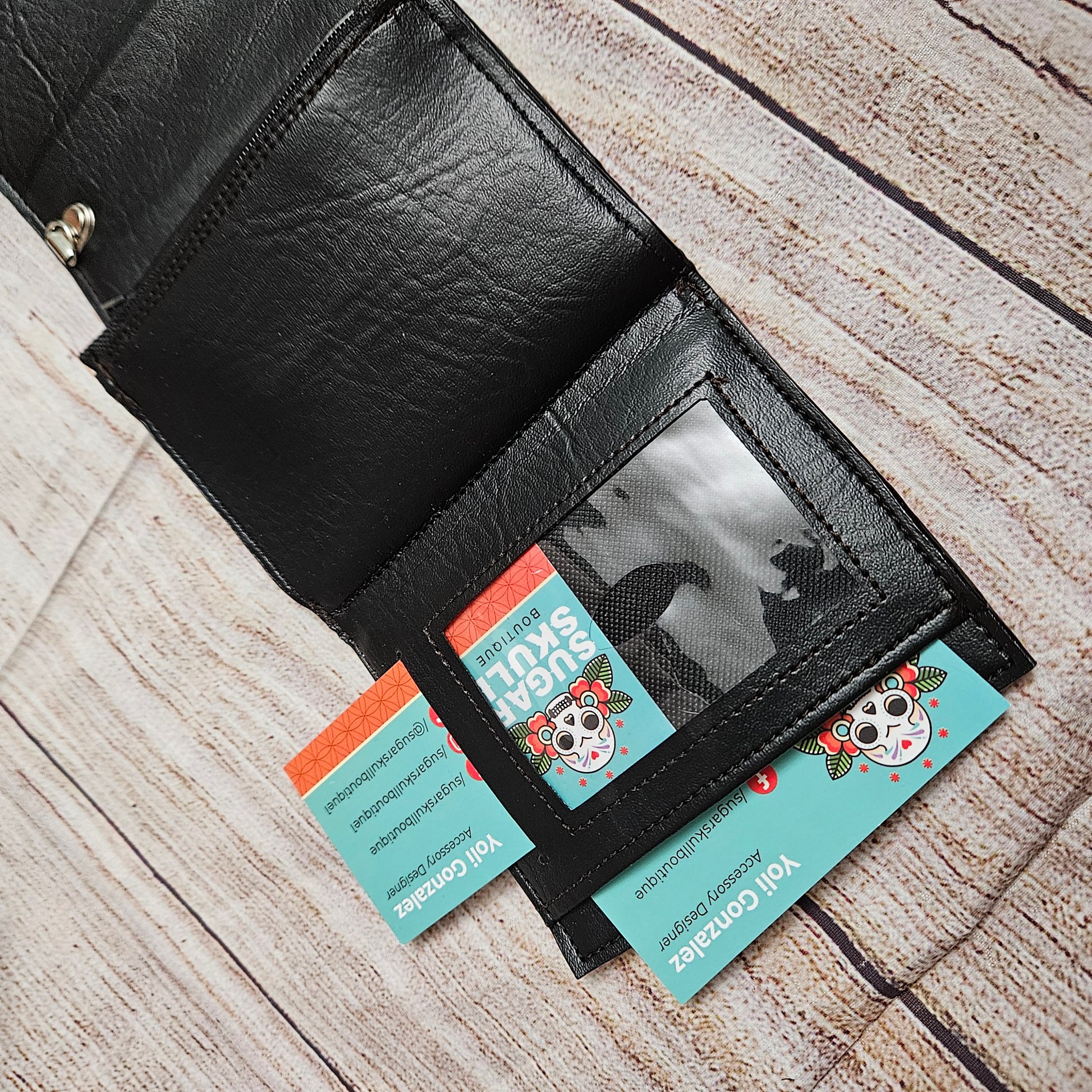 Amazing trifold wallet is made with a custom printed vinyl and black vinyl lining. It has a detachable wristlet strap, a zippered coin pocket and 3 card slots. It also has 2 slip pockets and and ID window slot. Keep it secured with the 2 magnetic snaps and your good to go!