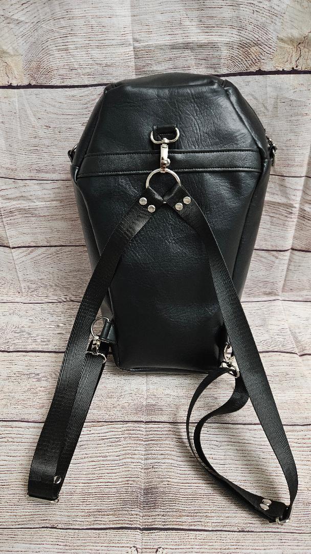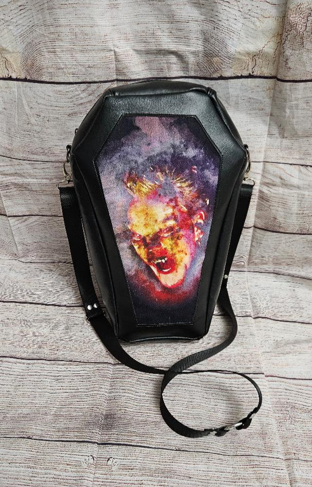 Introducing David's Coffin Convertible Bag - a versatile, high-quality bag made of vinyl and canvas. Waterproof lining and a spacious inside pocket make it perfect for any adventure. Transform it into a backpack or crossbody for added convenience. At 12" deep, it's ideal for all your essentials. Plus, the spooky design is sure to appeal to any vampire fan!