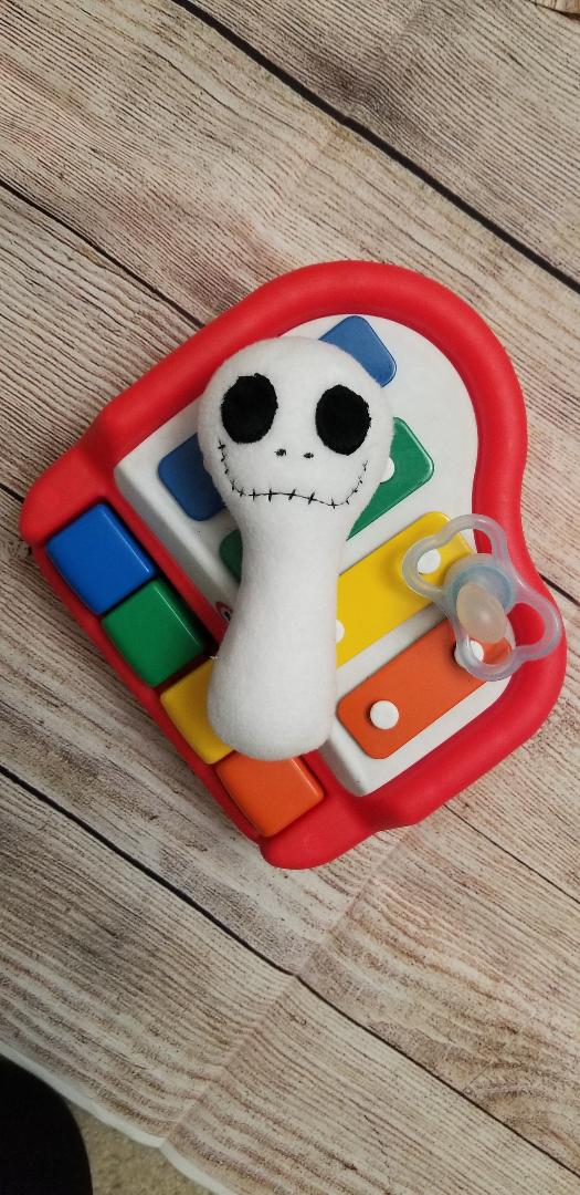 The Jack Baby Rattle is the perfect first toy for your little one. Made with soft fleece and minky materials, this rattle is gentle on delicate hands. Its soft rattle sound will entertain and soothe your baby while they explore their love for horror movies.