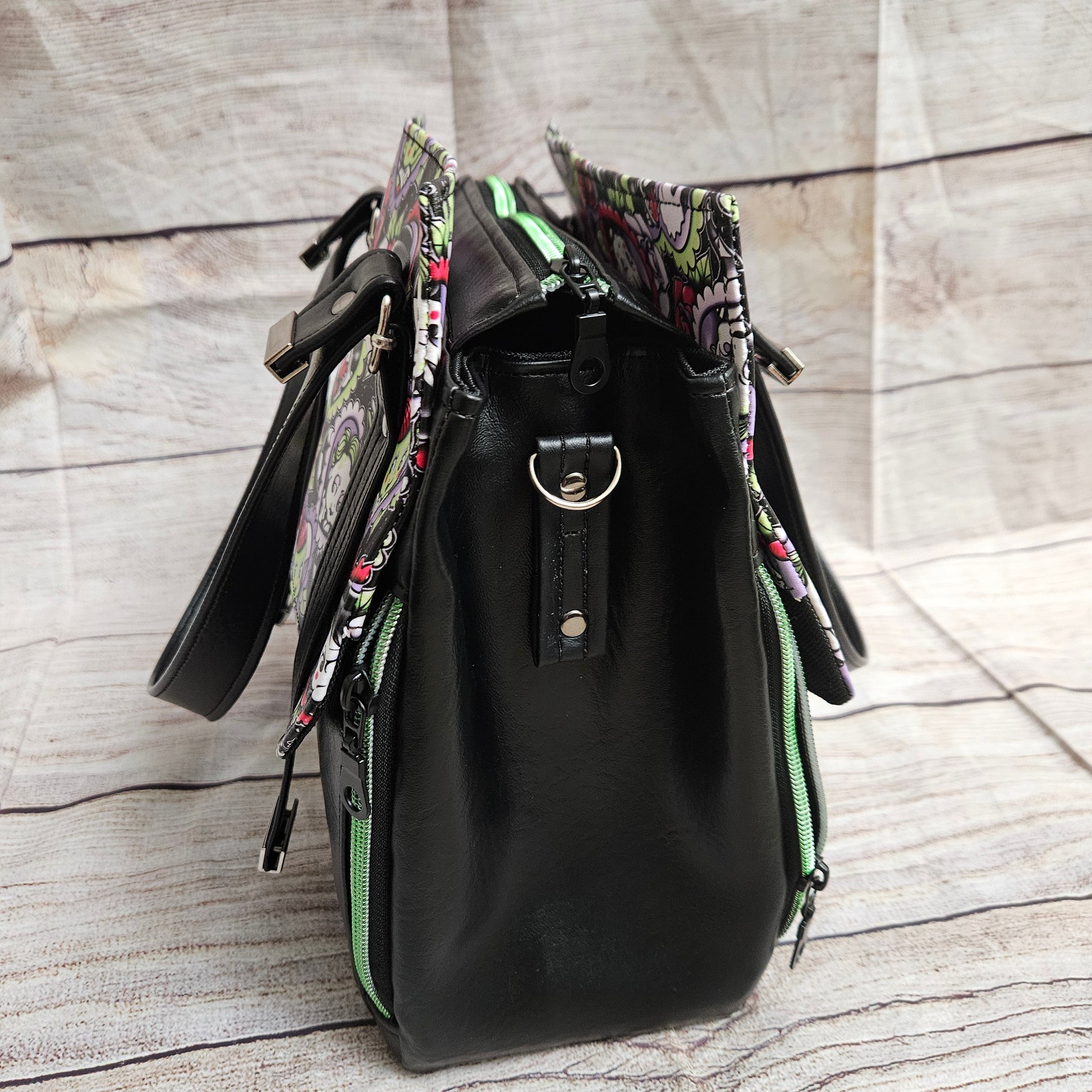 Such a cute design and it has an option to add a detachable crossbody strap. This bag is both a structured and soft, medium sized handbag that can also be carried as a crossbody bag. The unique shape is visually pleasing as well as interesting. The wide zippered pocket spans across both the front and back of the bag and closes at the top with a recessed zipper. Inside it has a waterproof lining with a zipper and a slip pocket. Make it yours and don't forget to check out the matching wallet.