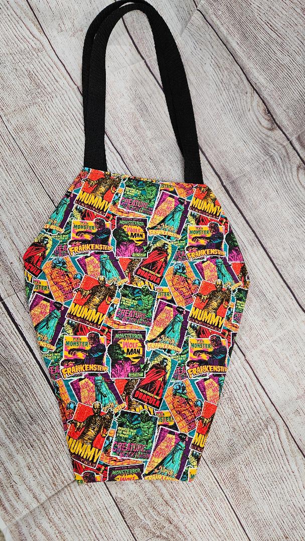 Expertly crafted with a waterproof lining, our Monsters Coffin Tote Bag is the perfect everyday accessory for carrying your essentials. Measuring 12 inches deep, this coffin-shaped bag showcases iconic classic movie monsters, making it a must-have for any fan or collector.