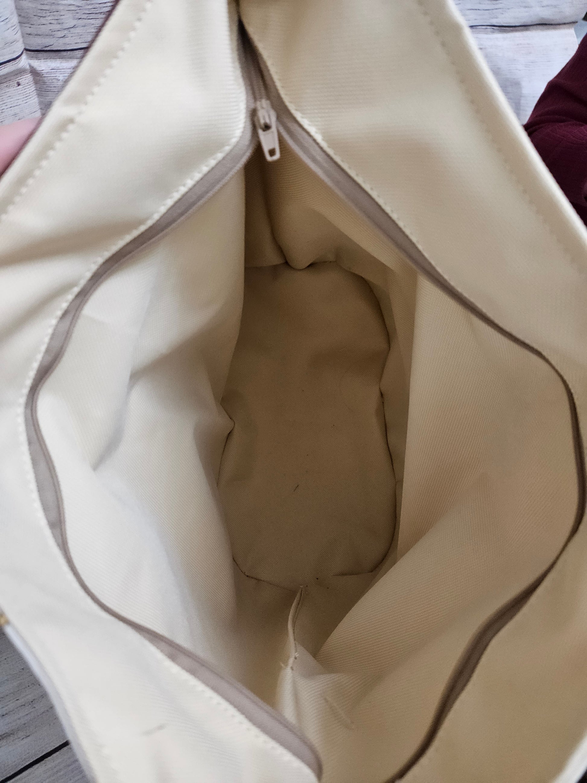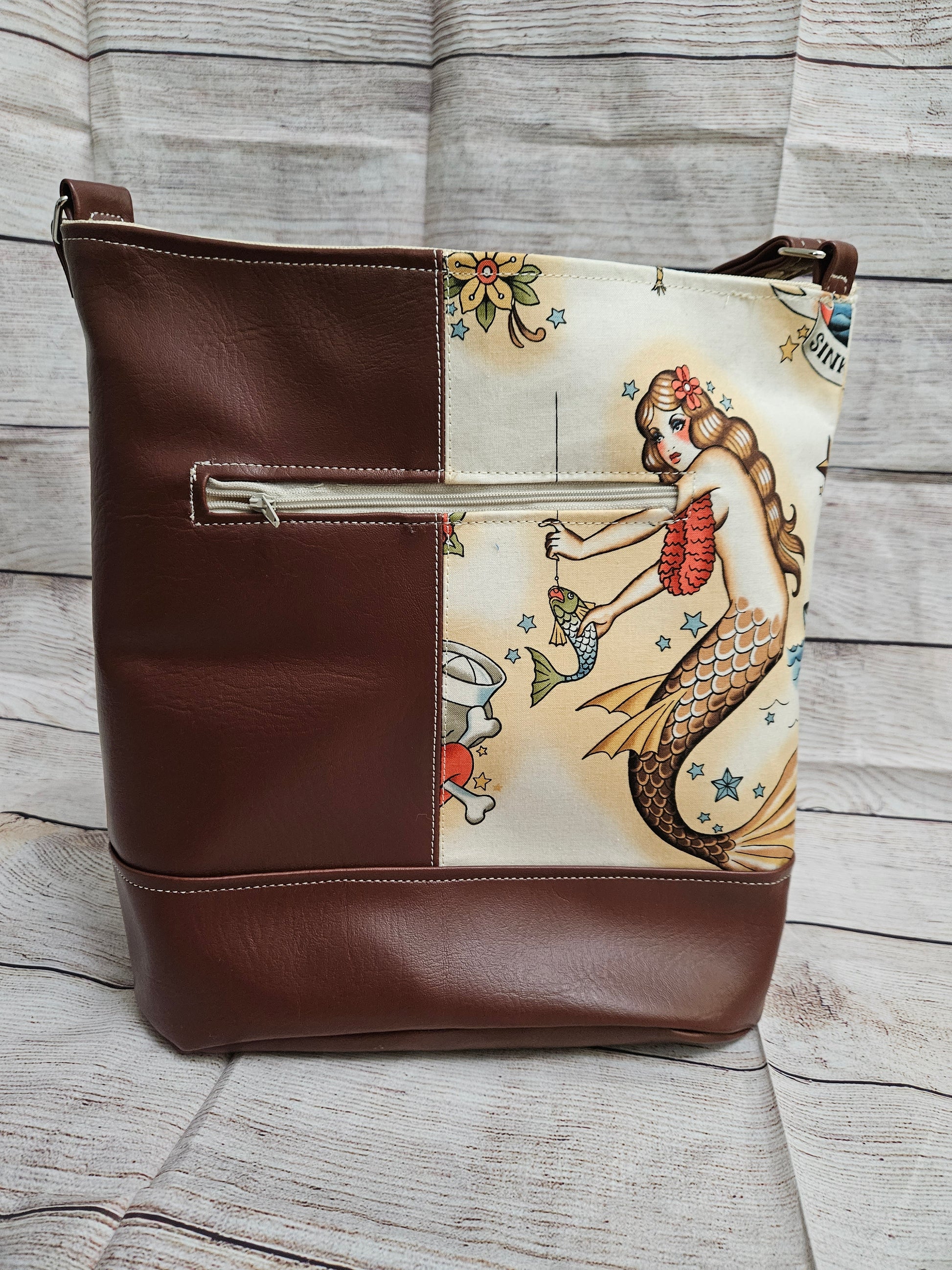 This bucket bag is made with a high quality vinyl, cotton woven and lined with a waterproof canvas. It is a shoulder bag that just says summertime. The back of the bag has a zippered pocket. At it's widest it is approx. 11" wide and approx 11" deep when zipped up but has potential to go up to almost 13 " deep. The size of this bag makes it a great everyday bag for anyone. Since each item is handmade please expect variations in fabrics and stitching.