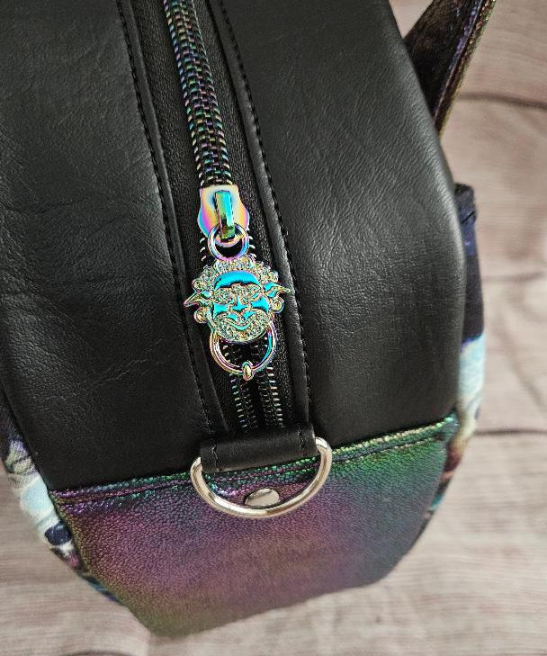 This is a perfect bag for any fan! Made with a high quality vinyl and a custom made cotton fabric. This bag will complete any outfit. It has a waterproof lining and a detachable crossbody strap. So that you can use it as a regular handbag as well. At it's widest point it is approx 10" wide and approx 8" deep. It has a slip pocket on both the front and back as well as a slip pocket inside the bag. It has a zipper closure and is everything you need in a bag.
