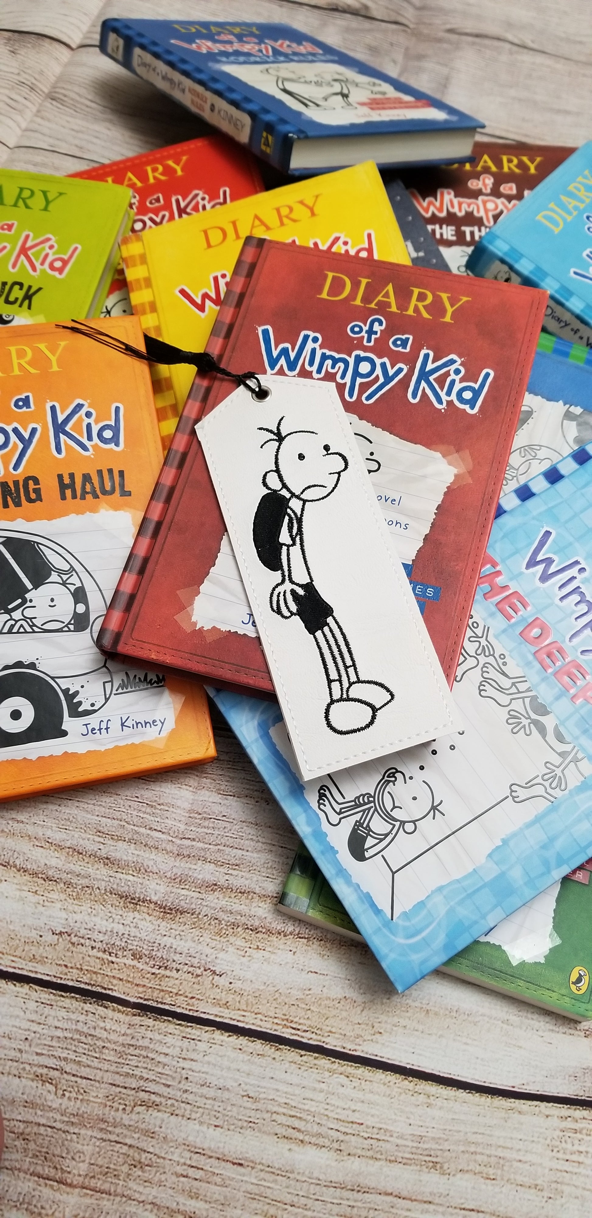 This Whimpy Bookmark, handmade with a tassel, is perfect for fans of the popular children's book series. The beautifully embroidered design on high quality vinyl ensures durability and a unique touch to your reading experience. A must-have for any "Whimpy Kid" enthusiast.